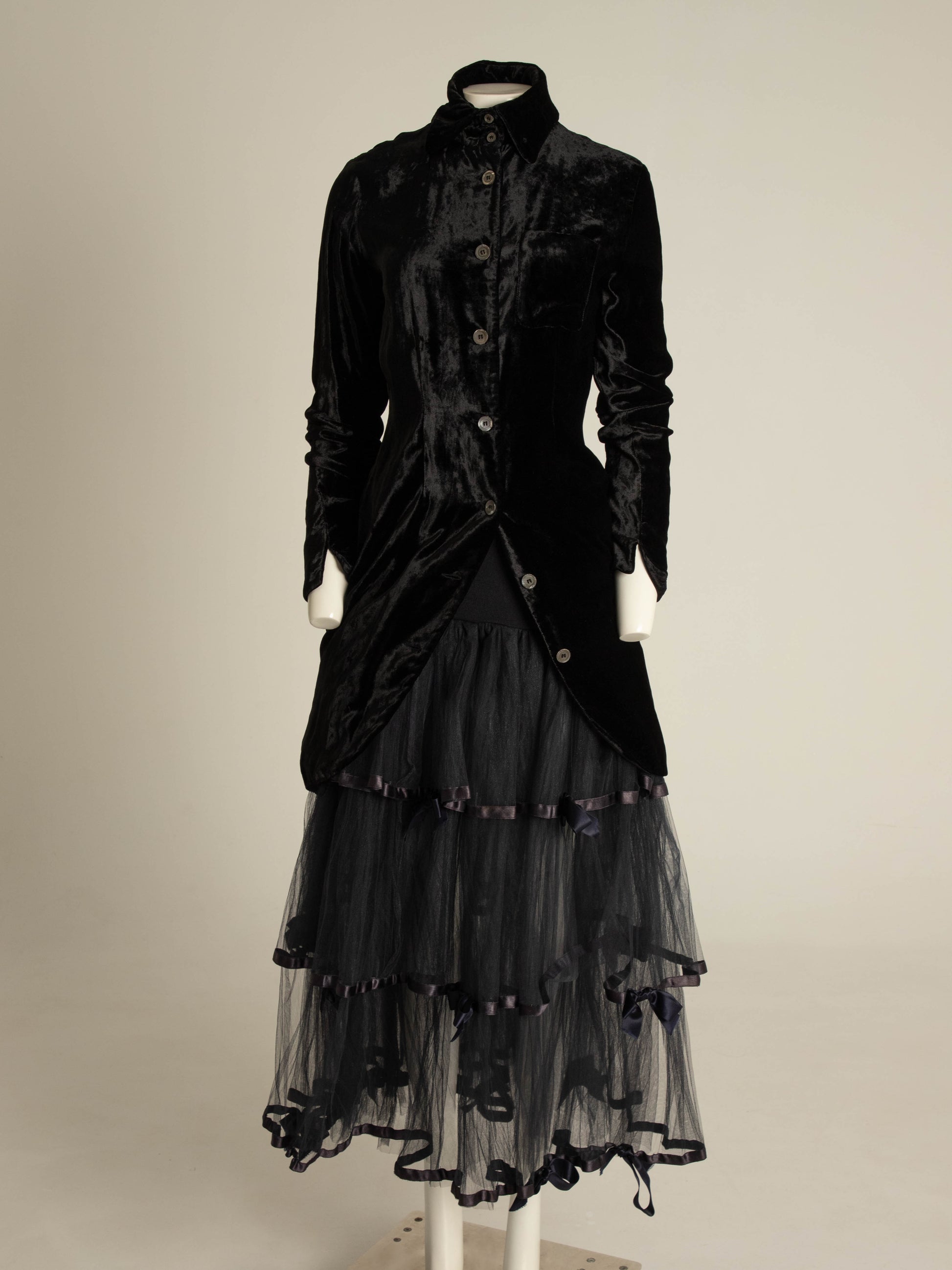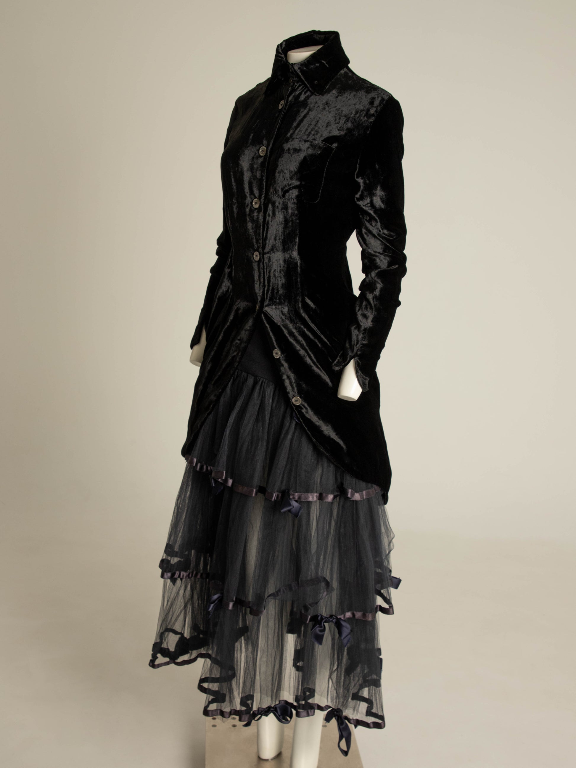 Full tiered sheer tutu in black tulle, edged with satin ribbon with bows interspersed along the hem and waist, leaving the impression of floating bows.