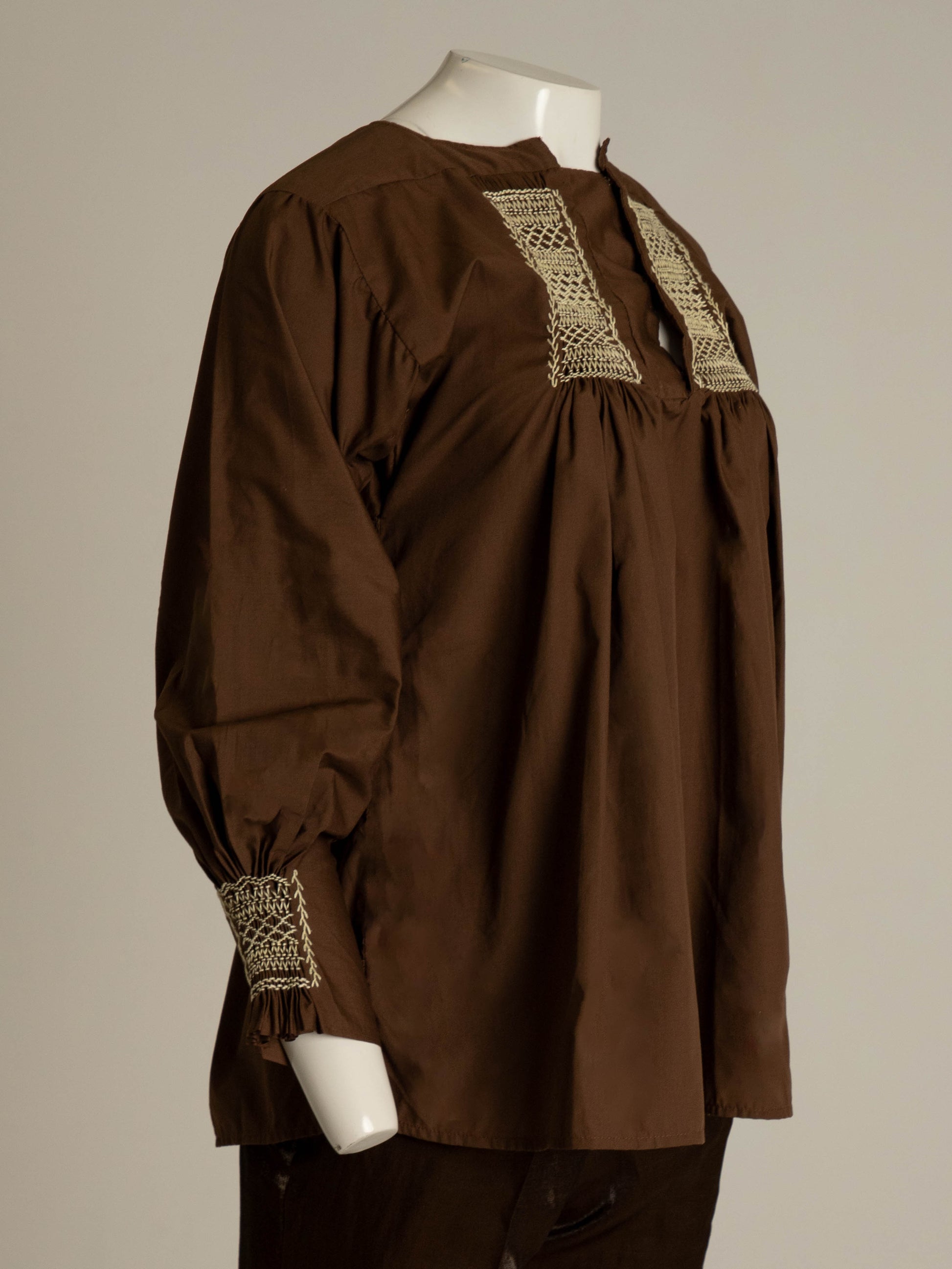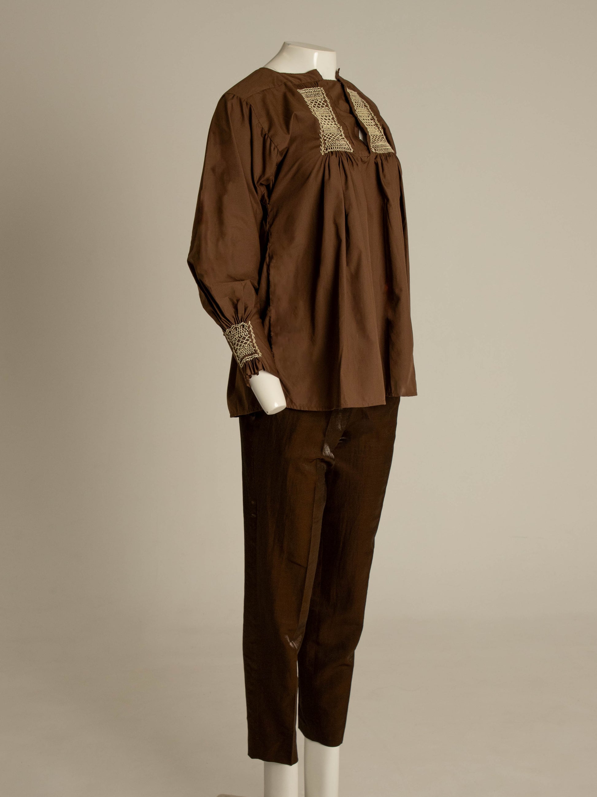 Smocking in cream on cuffs, center back and center front. The front neck has a short opening with smocking on either side. Due to the smocking the cuffs and lower body flares out as the pleating is released. Circa 1970s, hand made.