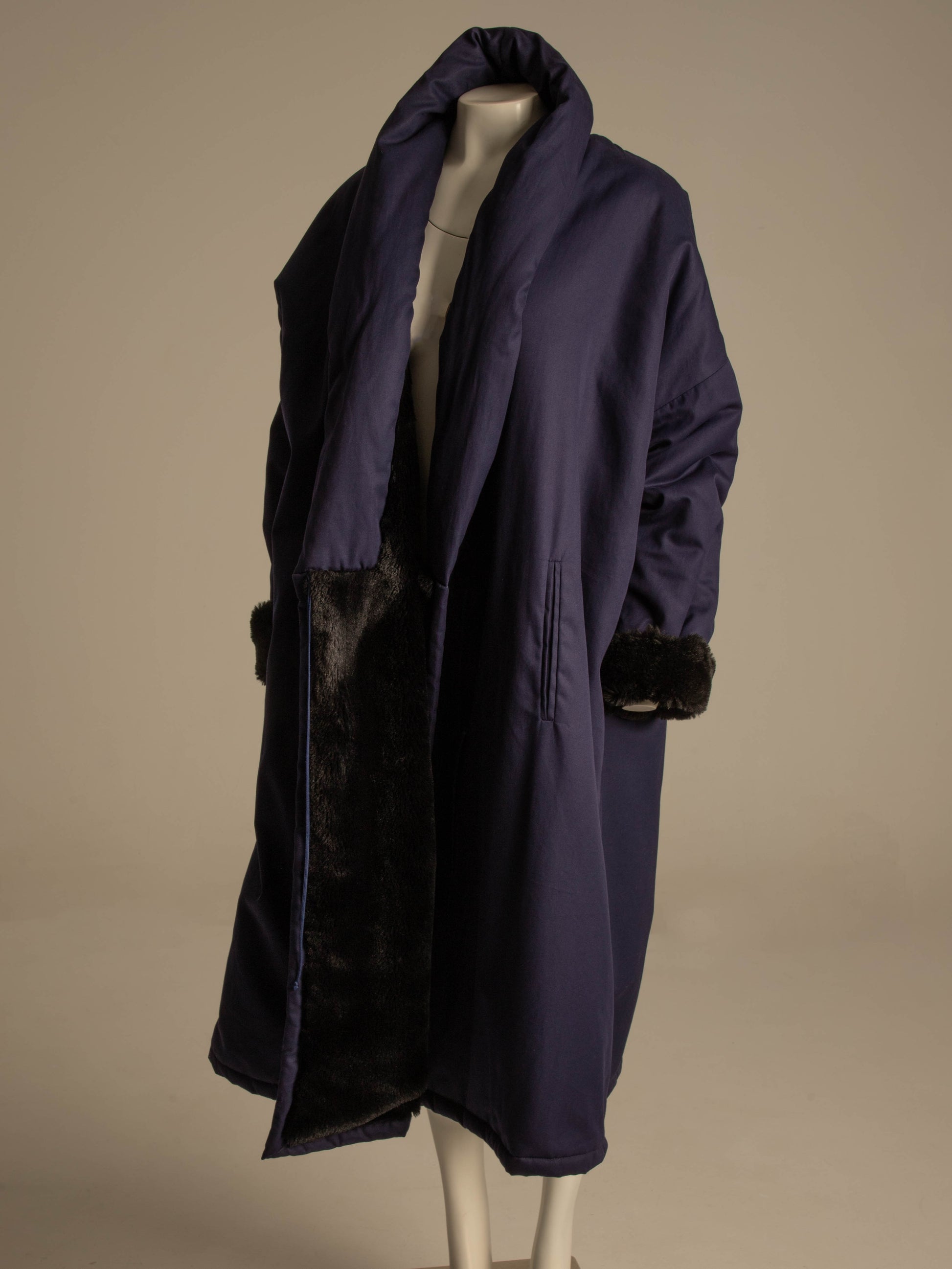 A wonderful warm navy cotton shawl collar coat lined with plush black faux fur. The front closes with a kimono style wrap over and a small tie. The fur rolls back to show at the cuffs. A-line shape with two jetted pockets on front.