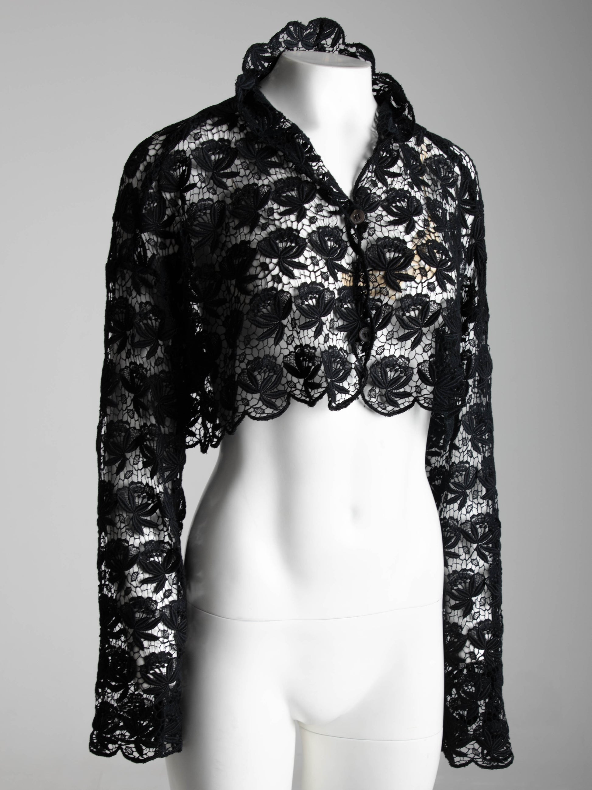Black cotton leaf lace design jacket. Cropped length, long sleeve, closed by two buttons. Scalloped edging and slight collar. Circa late 80s-early 90s.