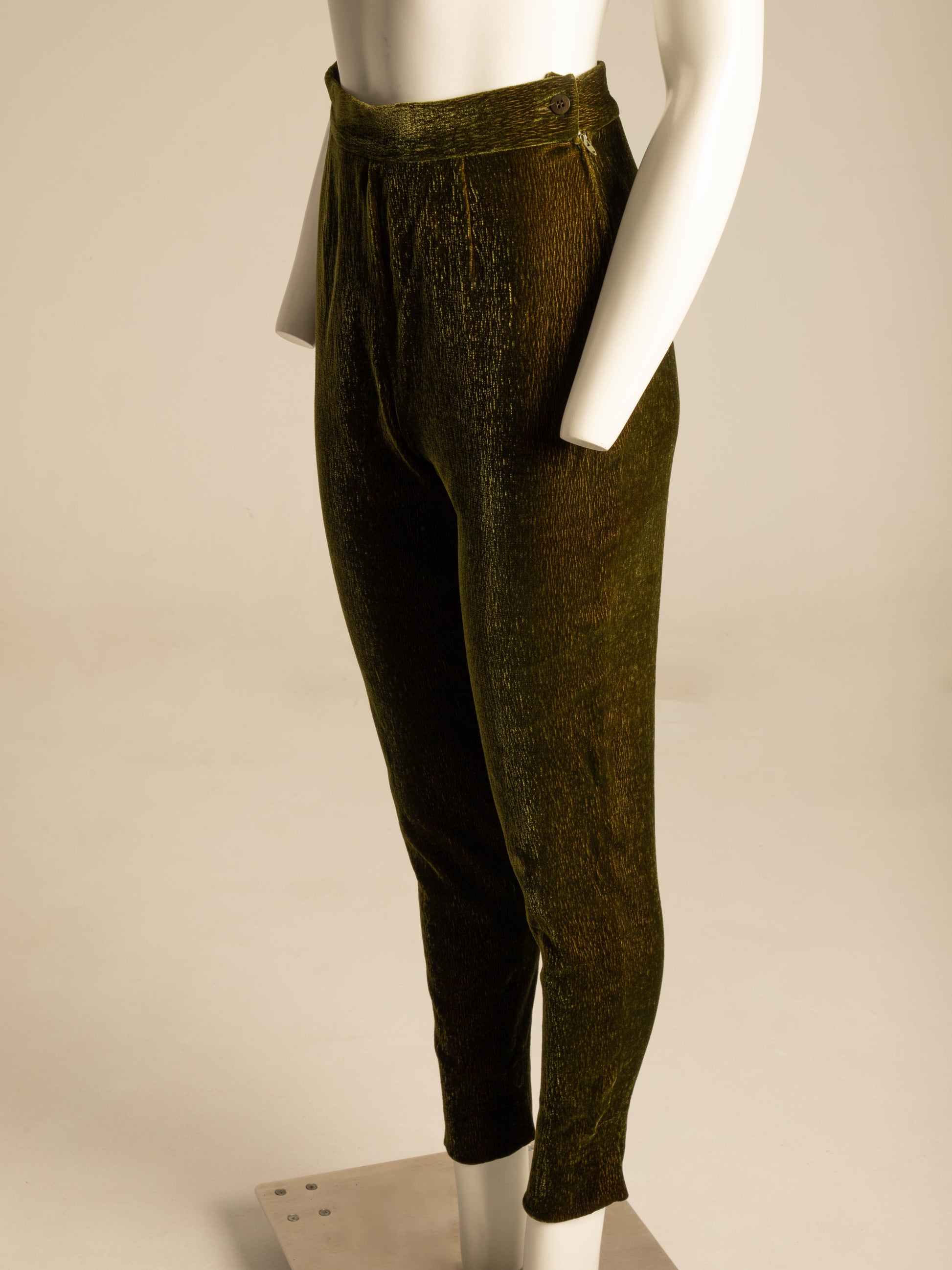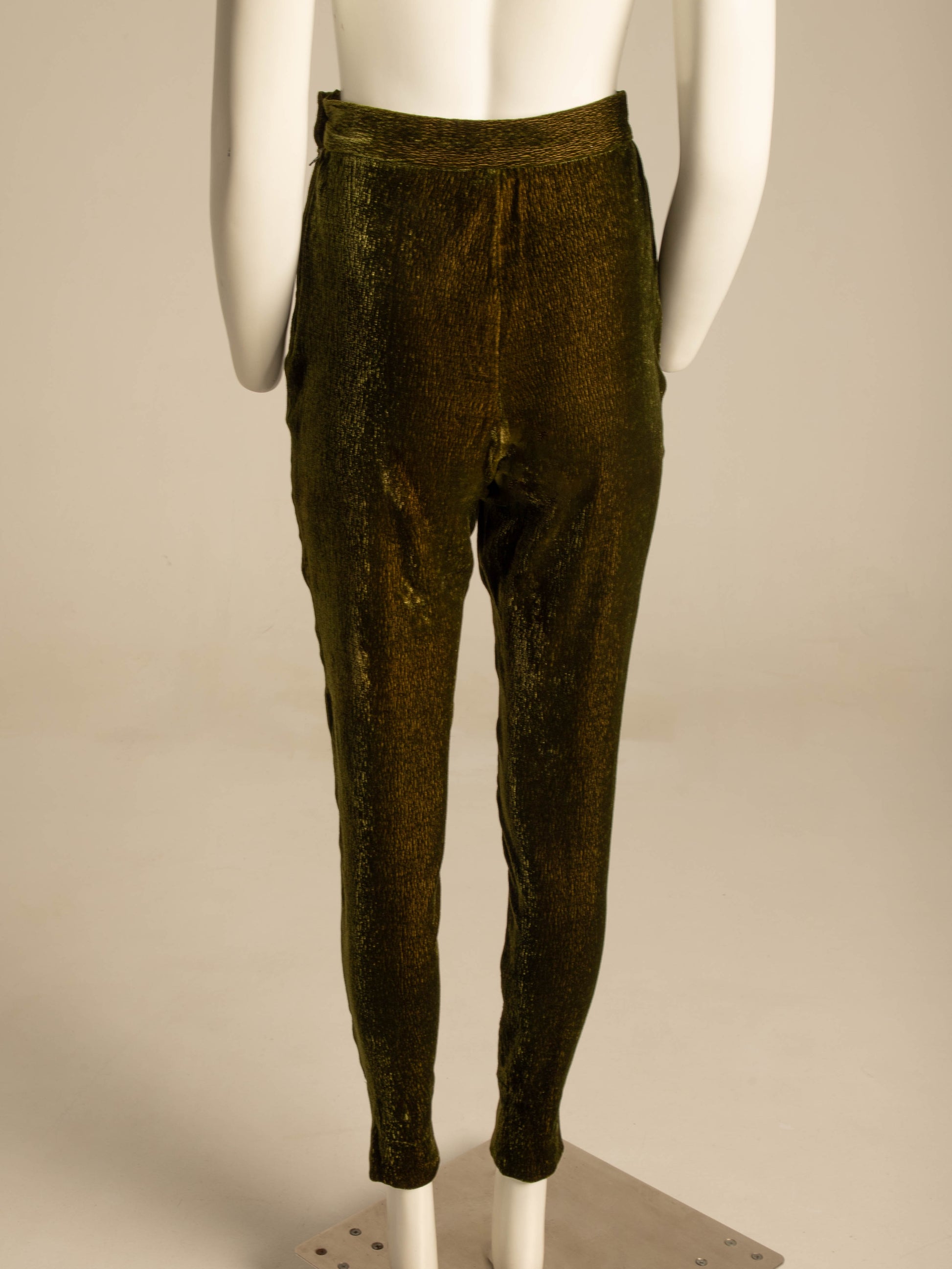 Olive green velvet with a wonderful woodgrain texture slim leg trousers. Can be worn cuffed at ankle. Zip closure at side.