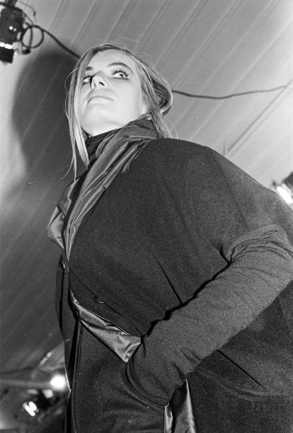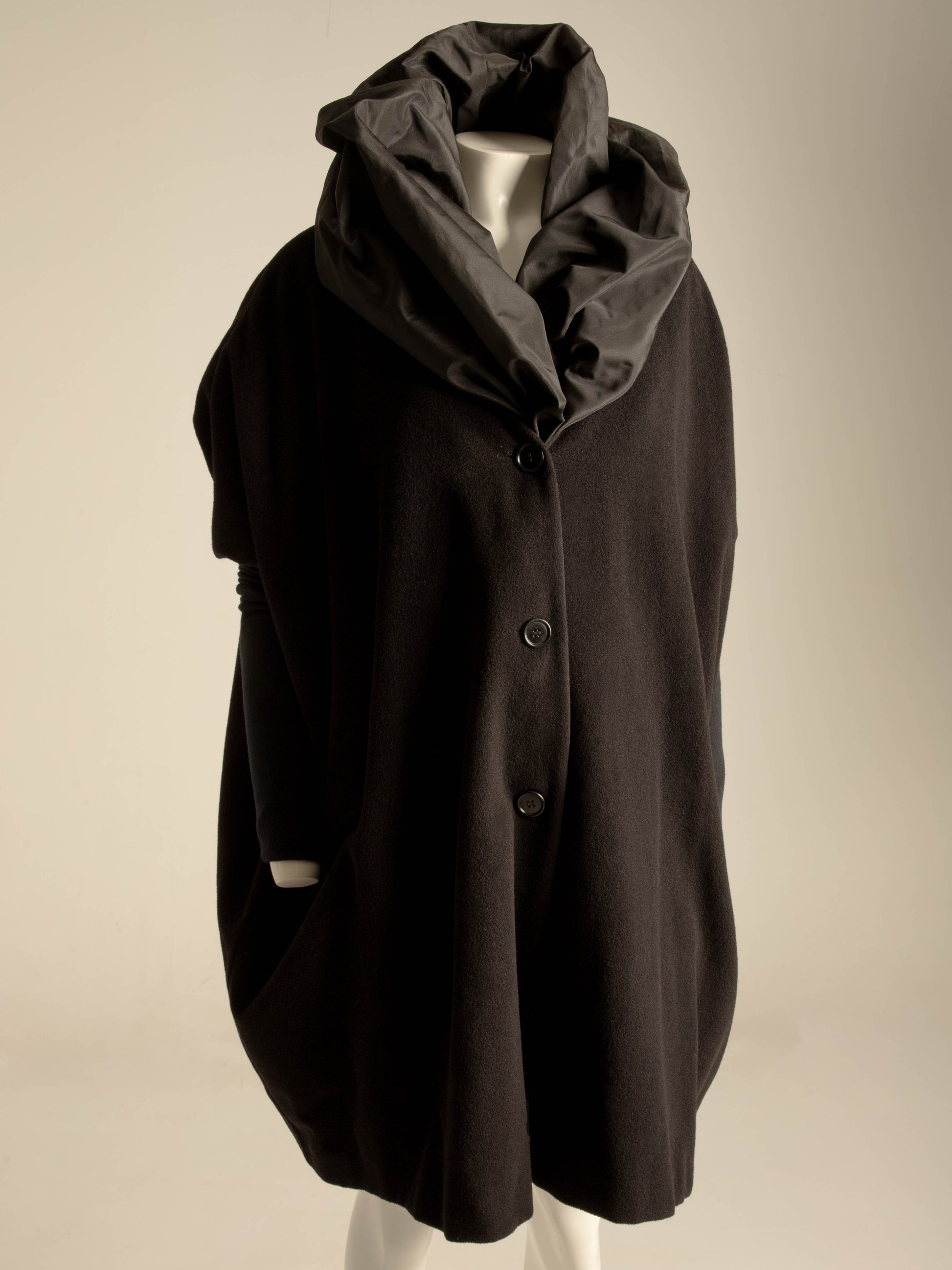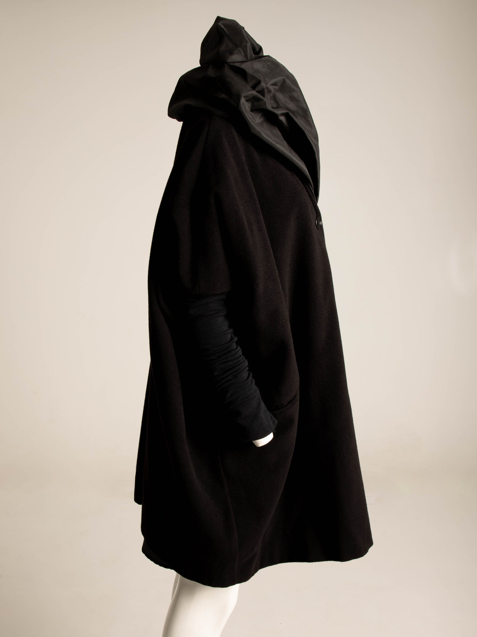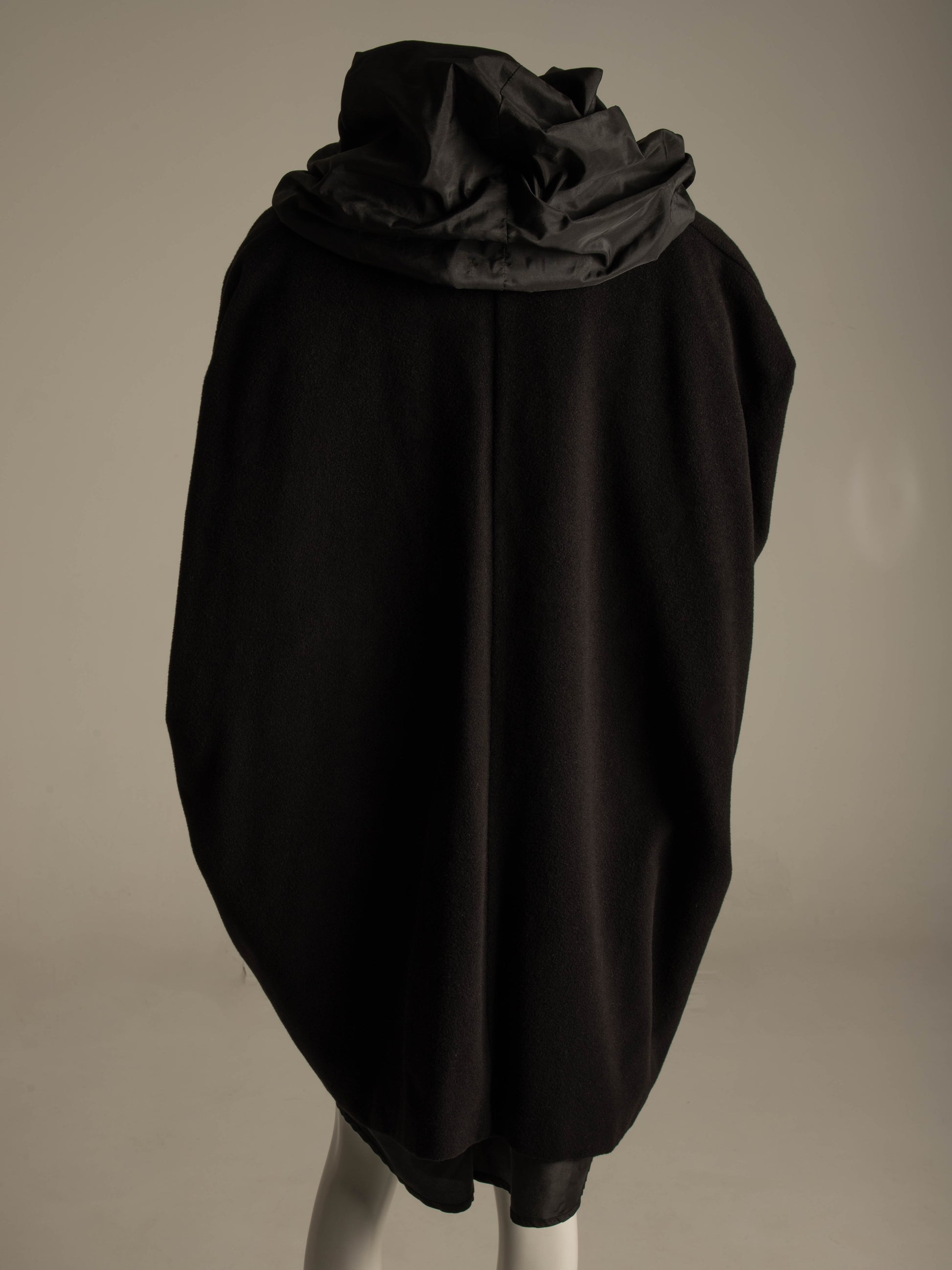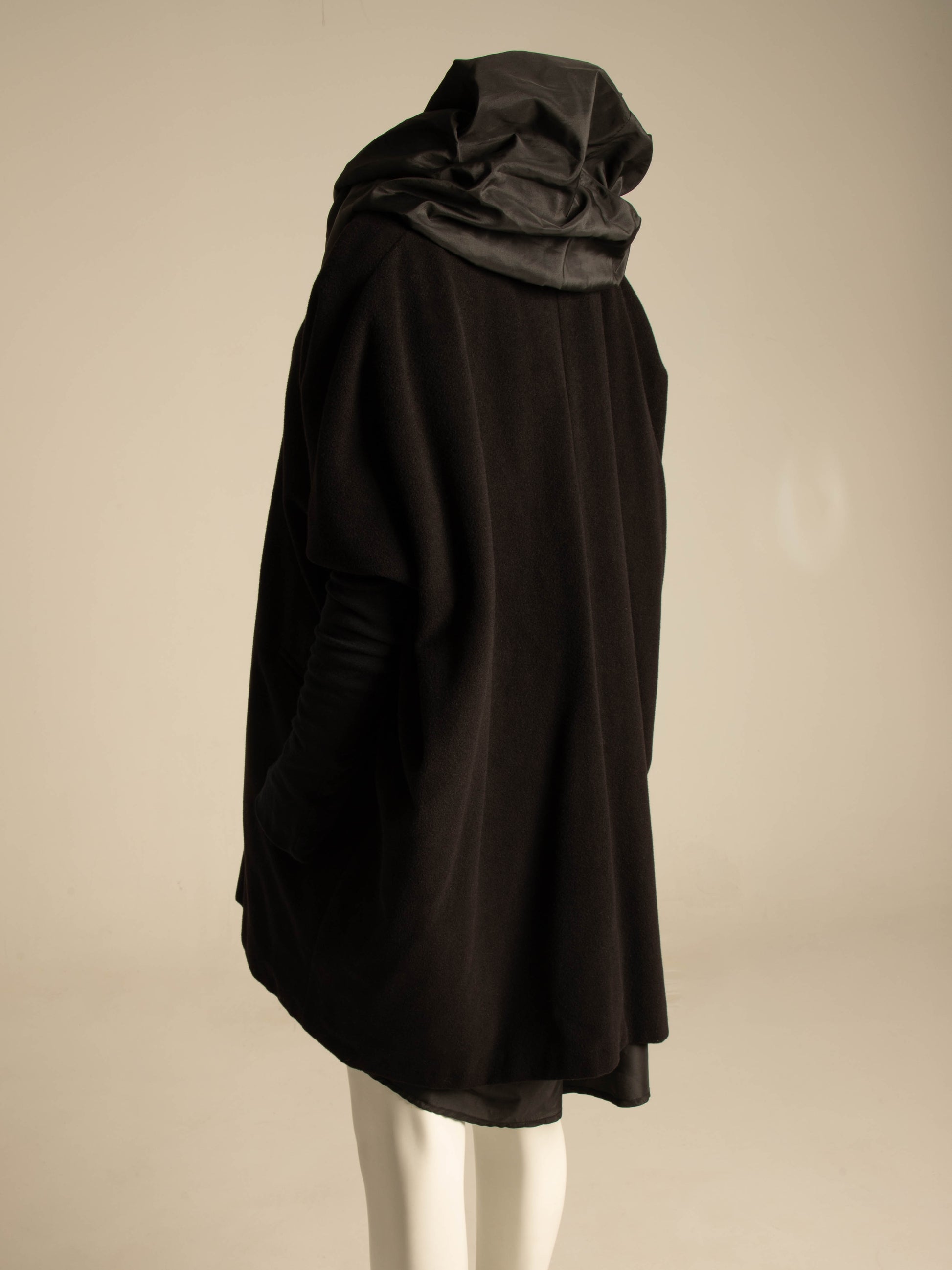 Black wide cut wool coat with fitted stretchy wool sleeves, lining in a black taffeta which blouses out at neckline and peeks out at hem. Jetted pockets either side at front. A classic romantic oversized coat style for Dolce & Gabbana during this period.