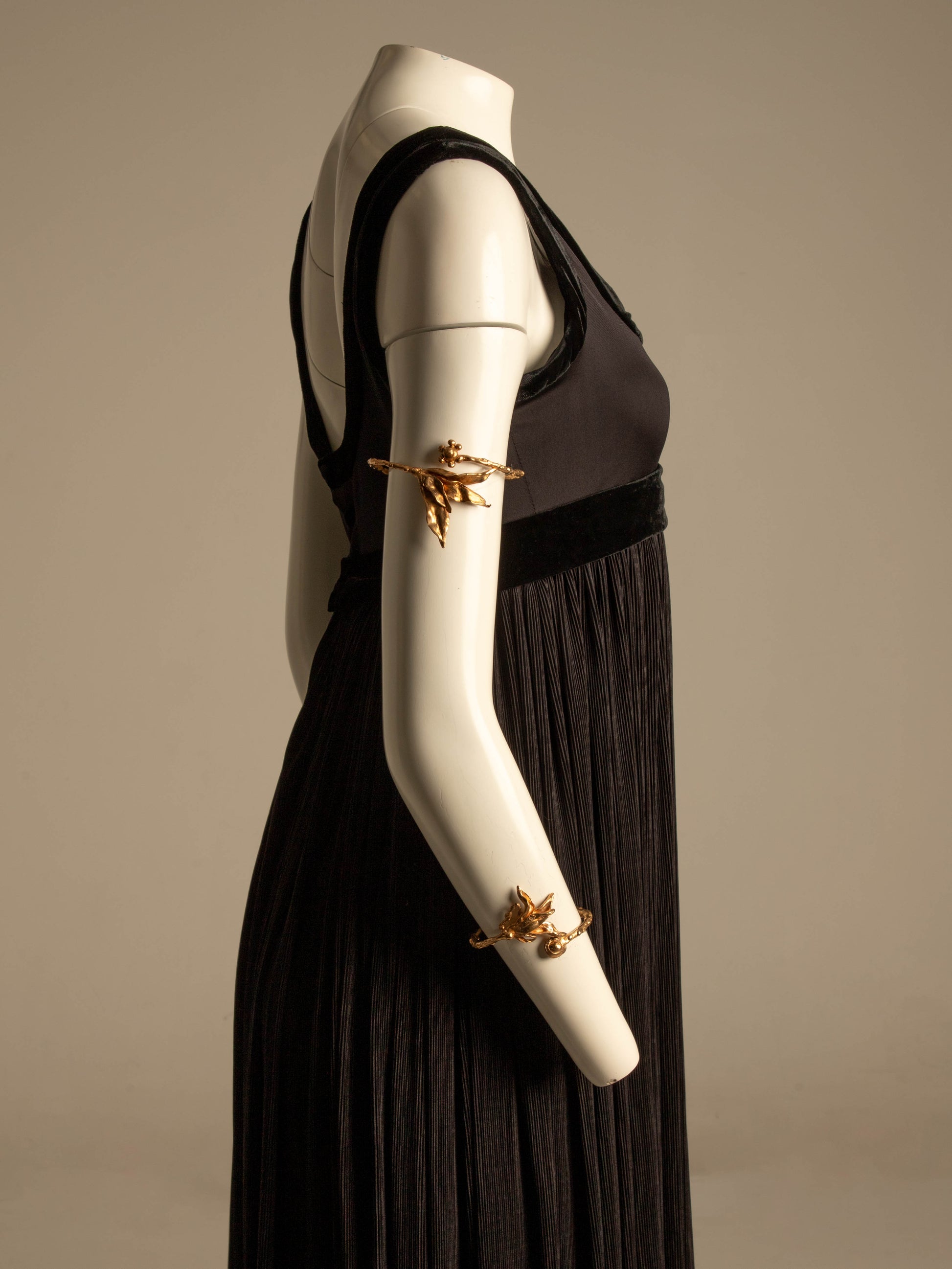 The natural world shapes her lost-wax cast works. Her Seafoam Entrails collection references the myth of Aphrodite’s birth and the organic formations created by seawater’s movement. She works directly with natural materials—seaweed, ferns, moss—studying their textures and occasionally incorporating them into the casting process. Her practice includes forming wax in moving water to generate unpredictable, intestinal shapes, allowing spontaneous natural forces to collaborate with artistic intention. These organically formed elements combine with hand-sculpted wax pressed with fingers and heated tools, creating imagery such as the flowering forms on her Budding Tendrils bracelets and armbands.