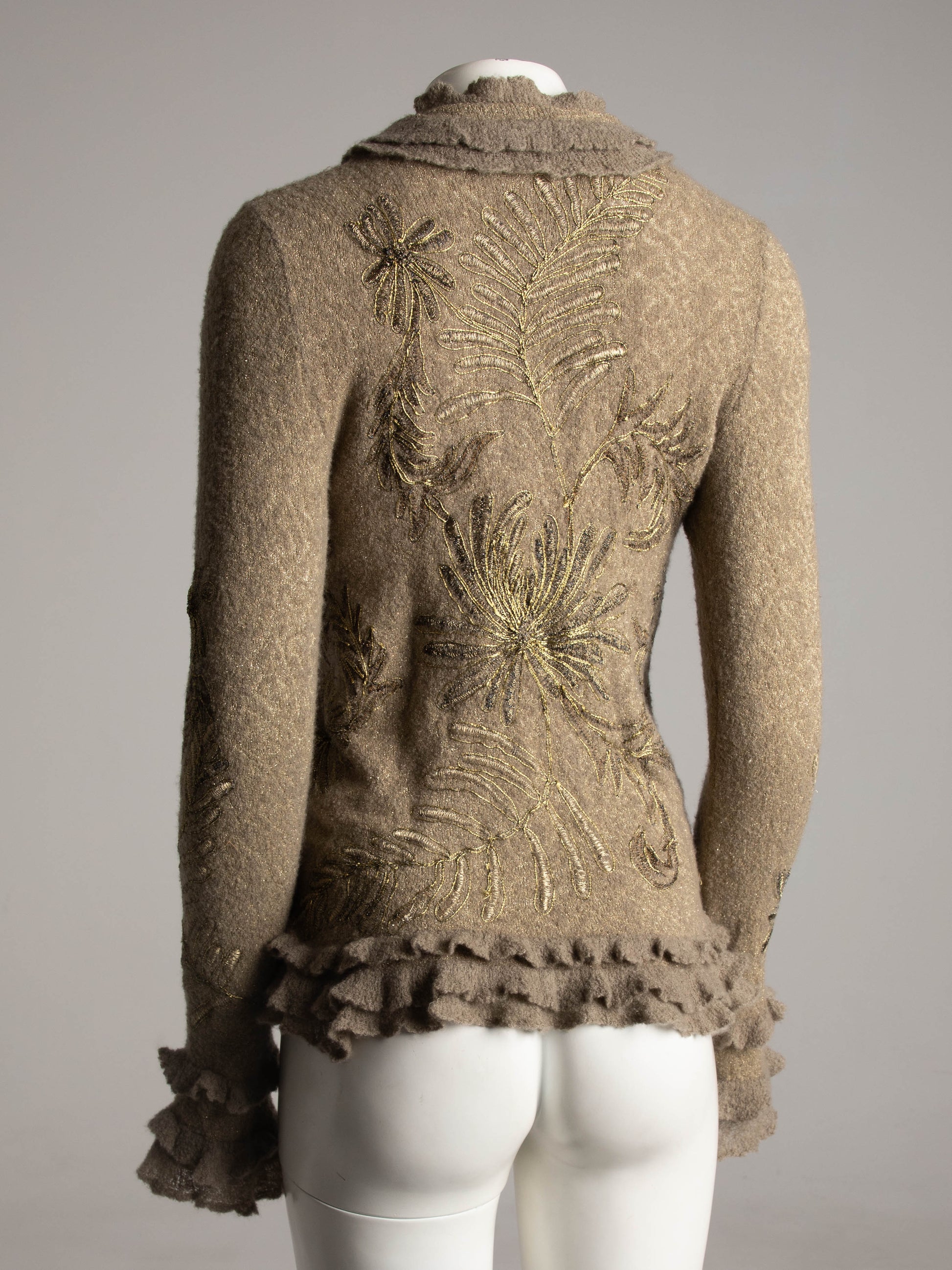 Soft cobweby cashmere in mushroom grey with gold embroidered designs of spiralling flowers and fern like leaves in gold metallic thread. Sleeve has a slight flare and is finished with ruffles as are all hems and neck. Closed down front with silver pop studs