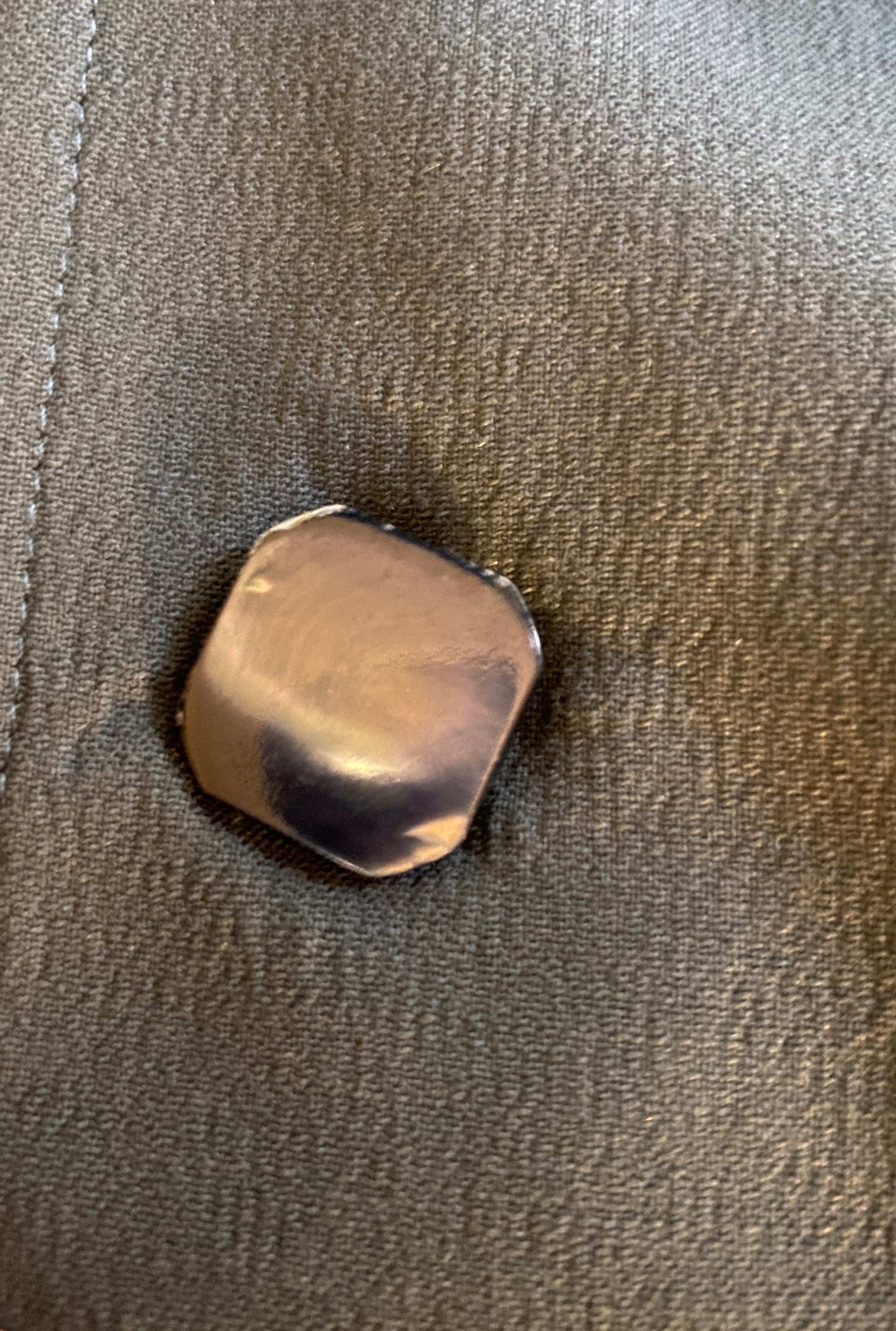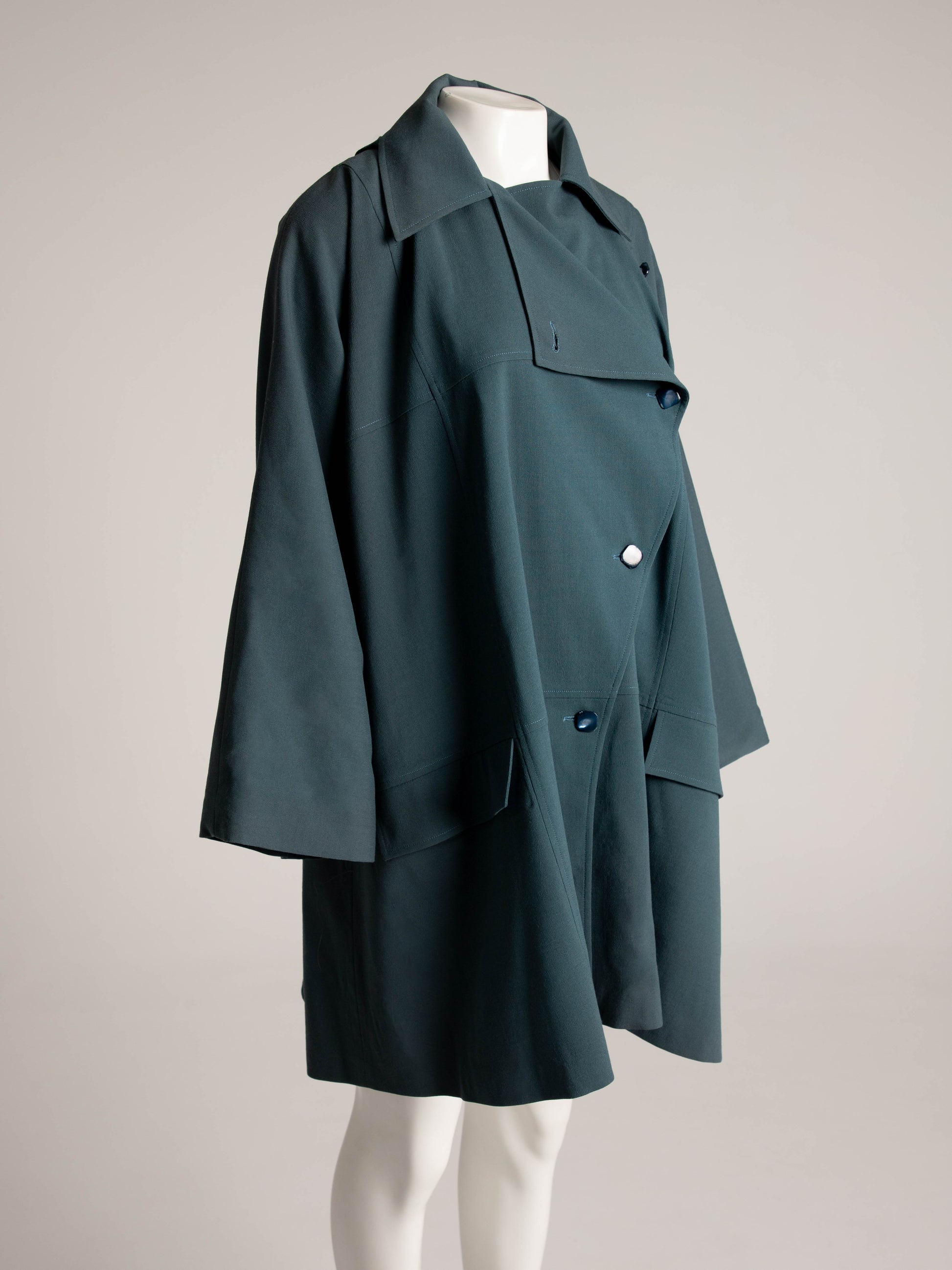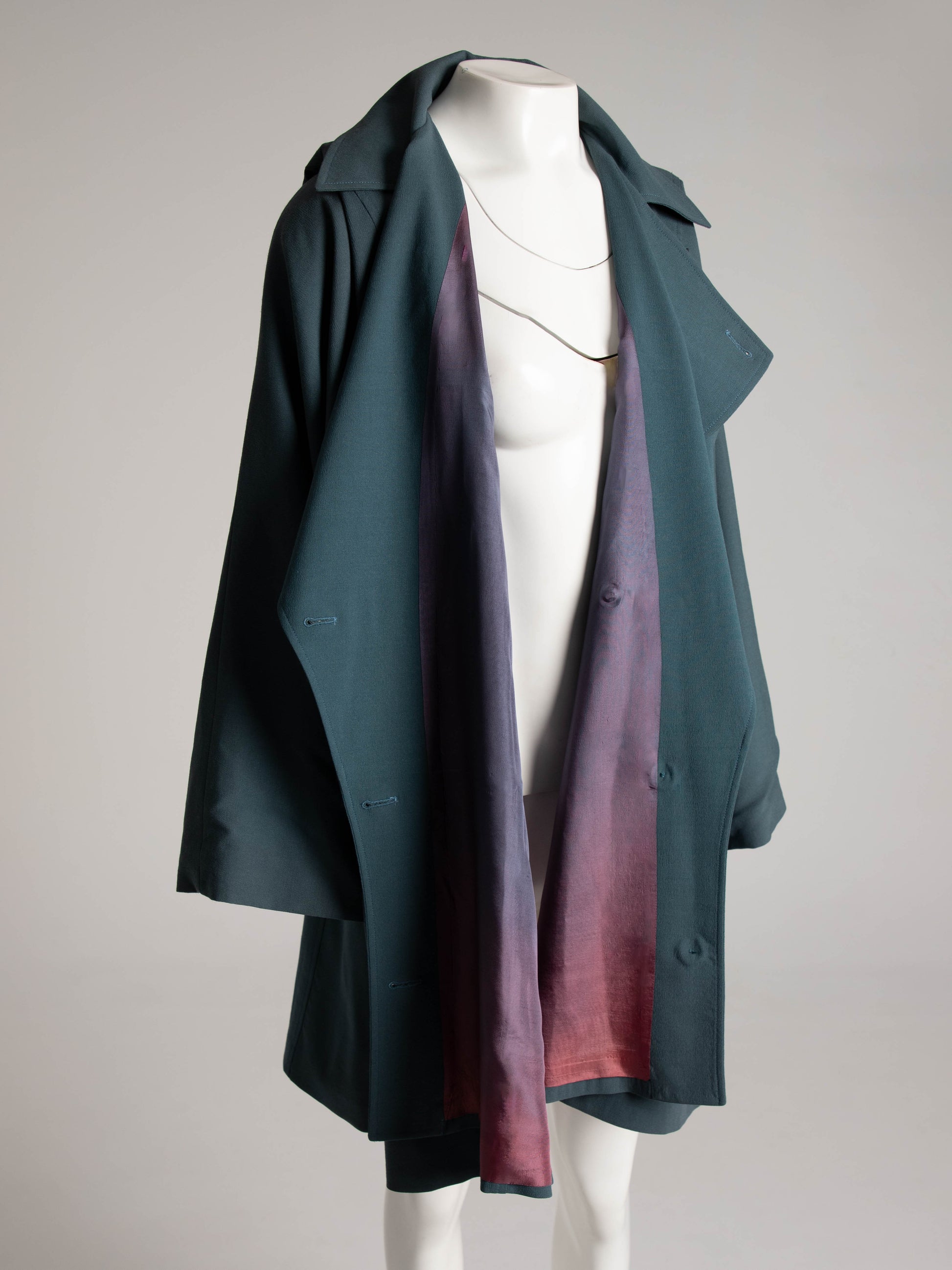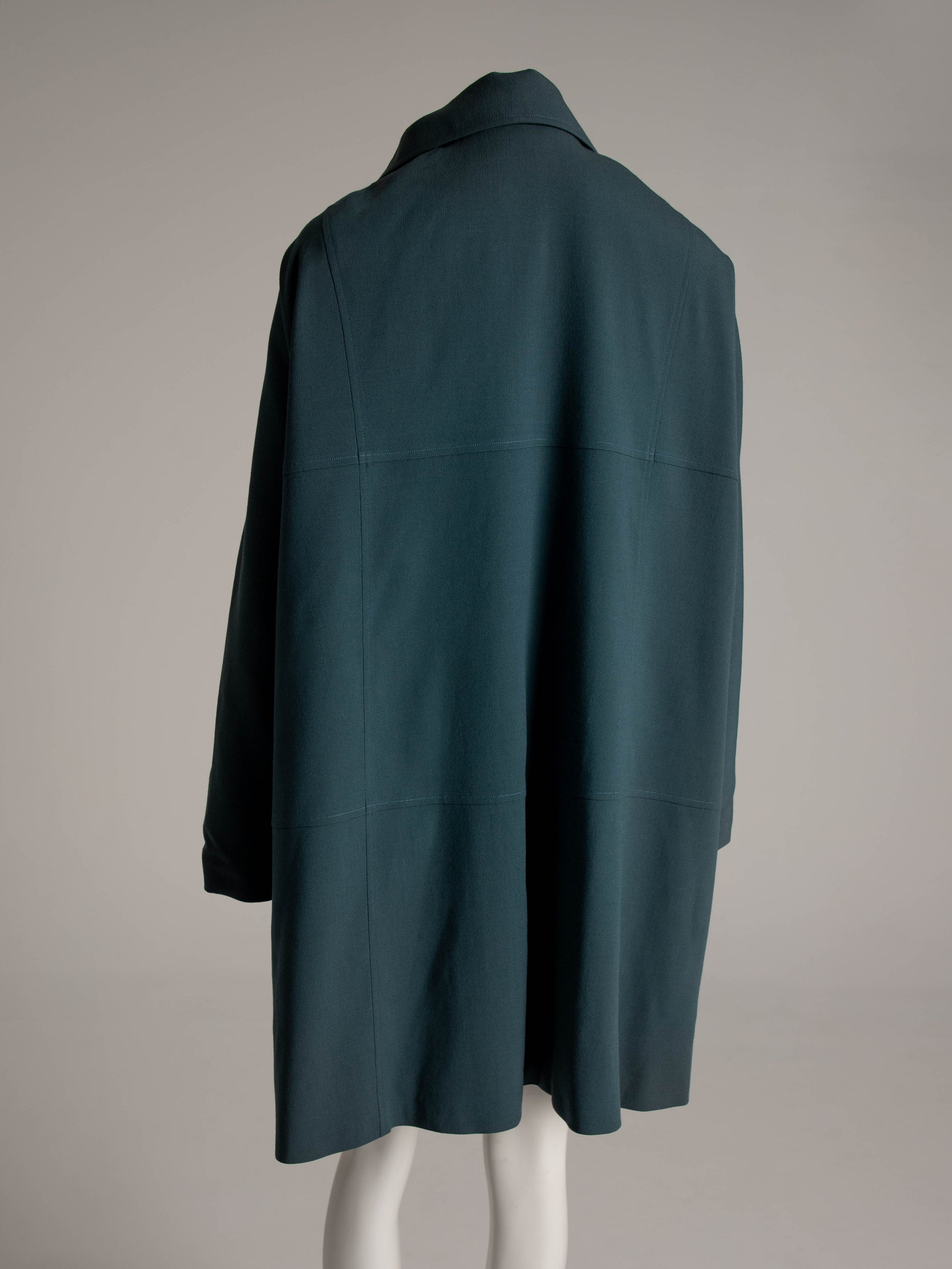 A rare and special piece by the French avant-garde designer Olivier Guillemin. A wide cut a-line coat in teal green with an unusual iridescent lining that changes between purple and blue . Cleverly panelled across the body with raglan style sleeve and a shaped front placket that sits diagonally across the body when closed. Front is closed by square blue green buttons. Generous patch flap pockets either side.