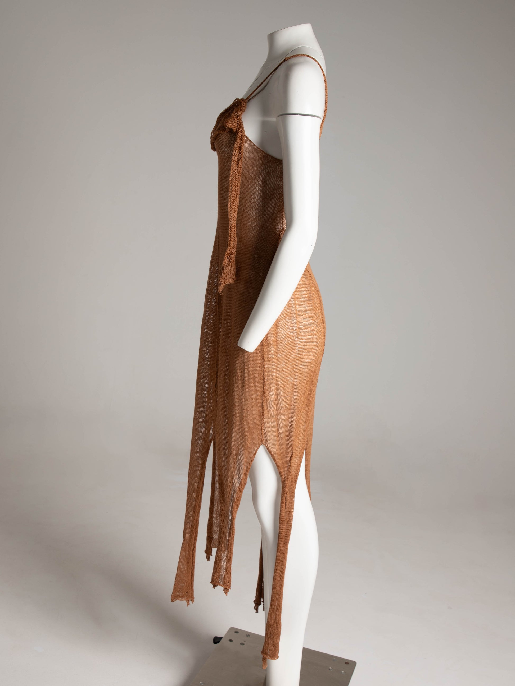 A knitted panelled slip dress with asymmetric hemline and shawl draped necklace. The Shetland Fern dress house two small ‘Shetland Fern’ details to imbue the garments with the magic of Scotland’s traditional crafts.