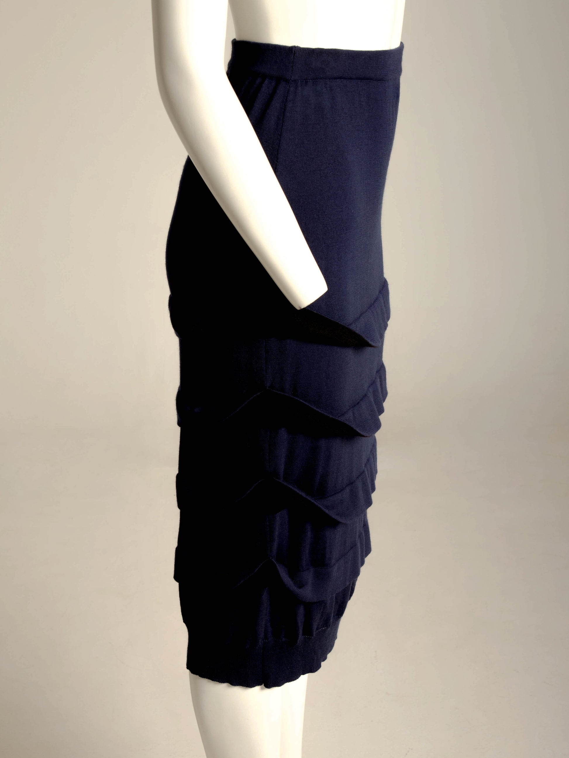 John Richmond and Maria Cornejo collaborated on Richmond Cornejo between 1984 and 1987 and their unique pieces are rare to come across. This original and unusual navy wool skirt has a series of tucks creating ridges which run horizontally across its length, the black under layer of these ridges is stitched up and exposed along one side seam. The waist is elasticated and the hem is finished with a knit rib.