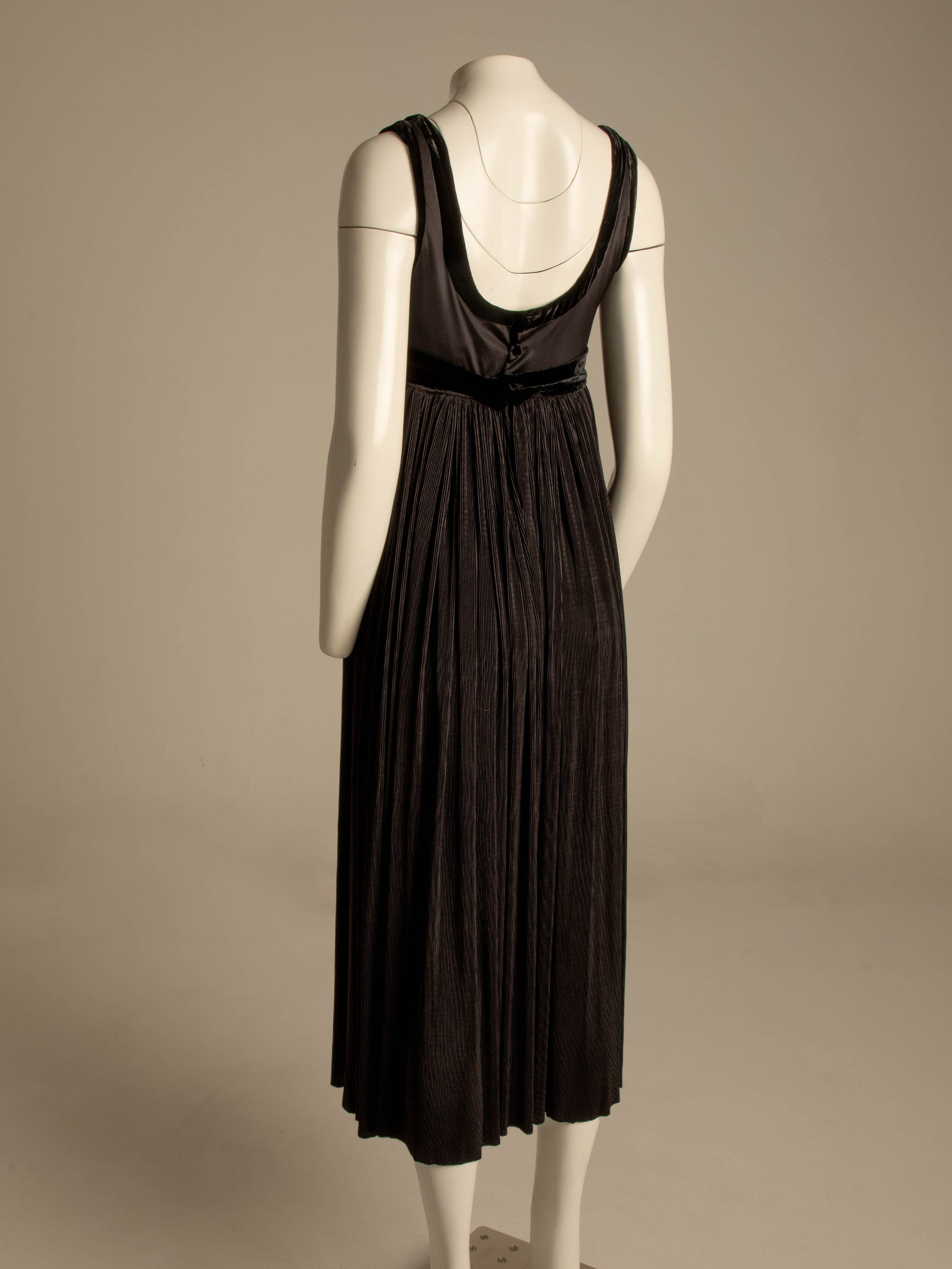 A classical silhouette, fine pleating hangs from under bust, bodice is edged with soft black velvet. The dress closes with buttons down the back.