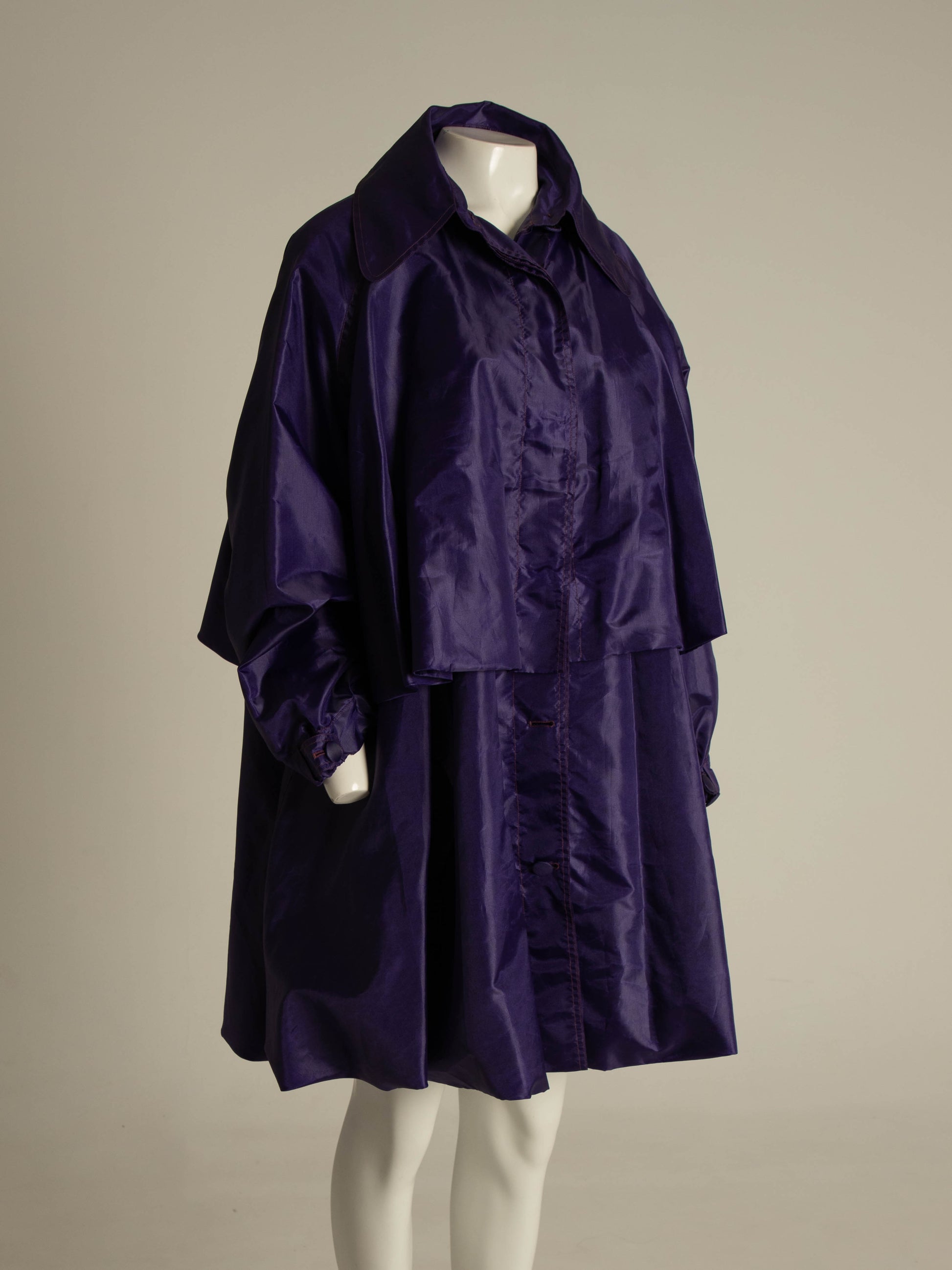 Dark purple nylon coat in the style of a trench coat with balloon hem. Raglan sleeve with elasticated cuff. Comes with a large matching drawstring bag with a knot at the base in which to store it.