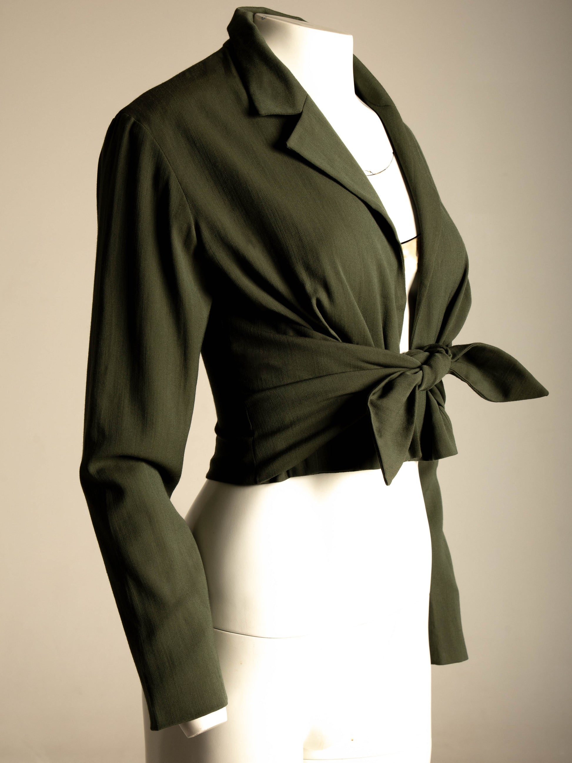 From Sybilla's 'Aeroporto' travelling clothes collection A/W 1989. A jacket which could also be worn on its own as a blouse. It has a green wool exterior with a tan brown silky lining. Front is closed by ties, a characteristic feature of this collection.