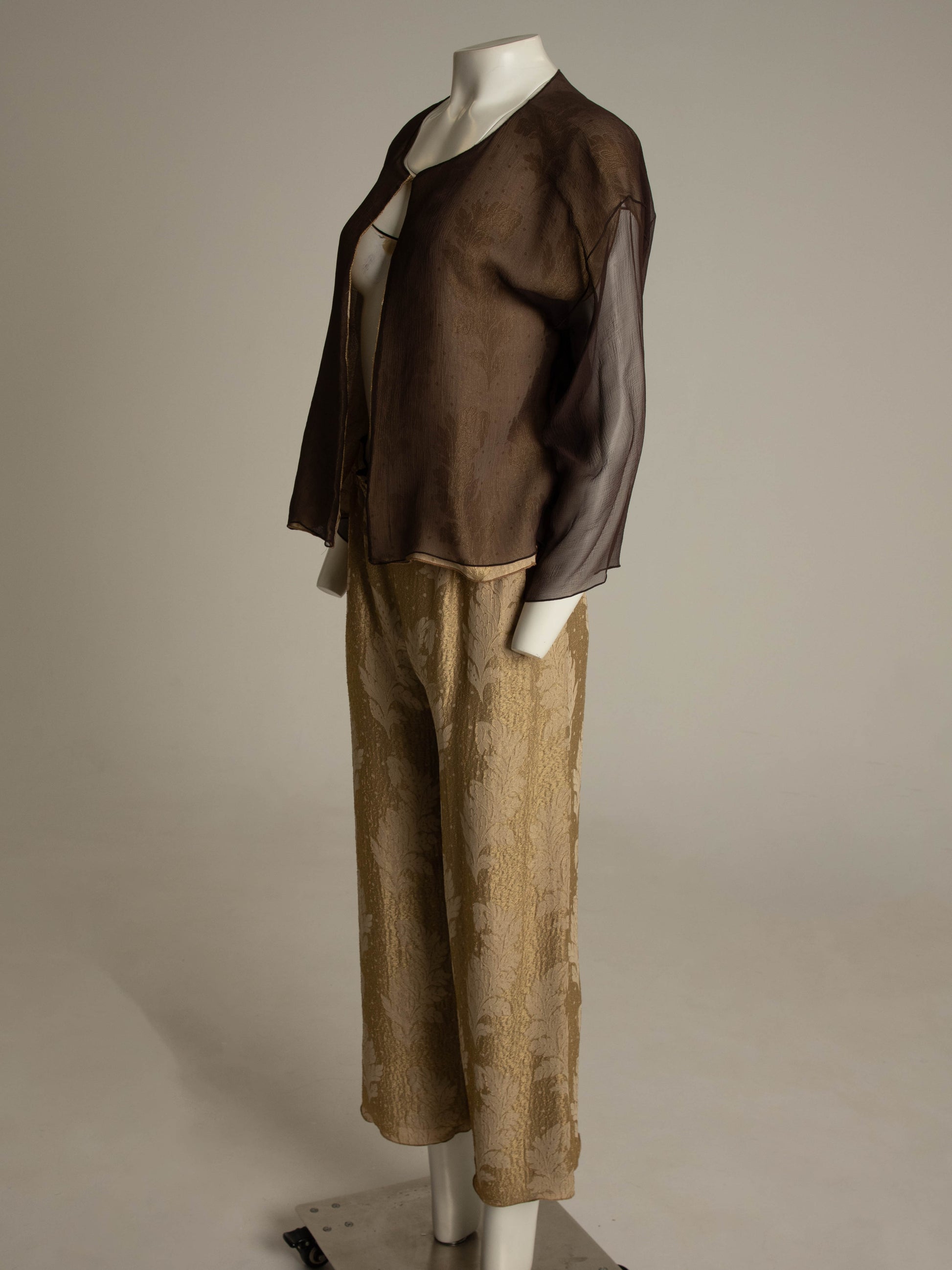 Double layer, one gold with leaf designs the other dark brown silk chiffon. Cardigan style top, gold layer is short sleeve, finished with a single tiny button. Trousers are wide cut with elasticated waistband. Finished with baby lock edging. Can be worn reversed.